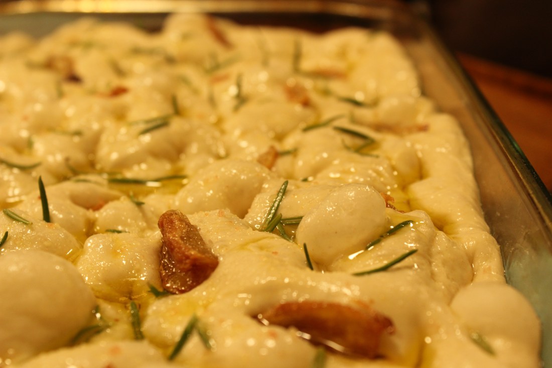 Standing by the window, looking up the grey sky. “What am I going to make today?” said I silently. I remember that I bought some beautiful smoked chicken from a market near my place. As soon as I imagined the thinly cut slices, I began to smell the garlic confit soaking its foxy coloured body in my Staub. The smell of the garlic, roasted rosemary, and golden coloured olive oil. The right side of my lips slightly move up. Yep, I need focaccia for some sandwich for a special treat.